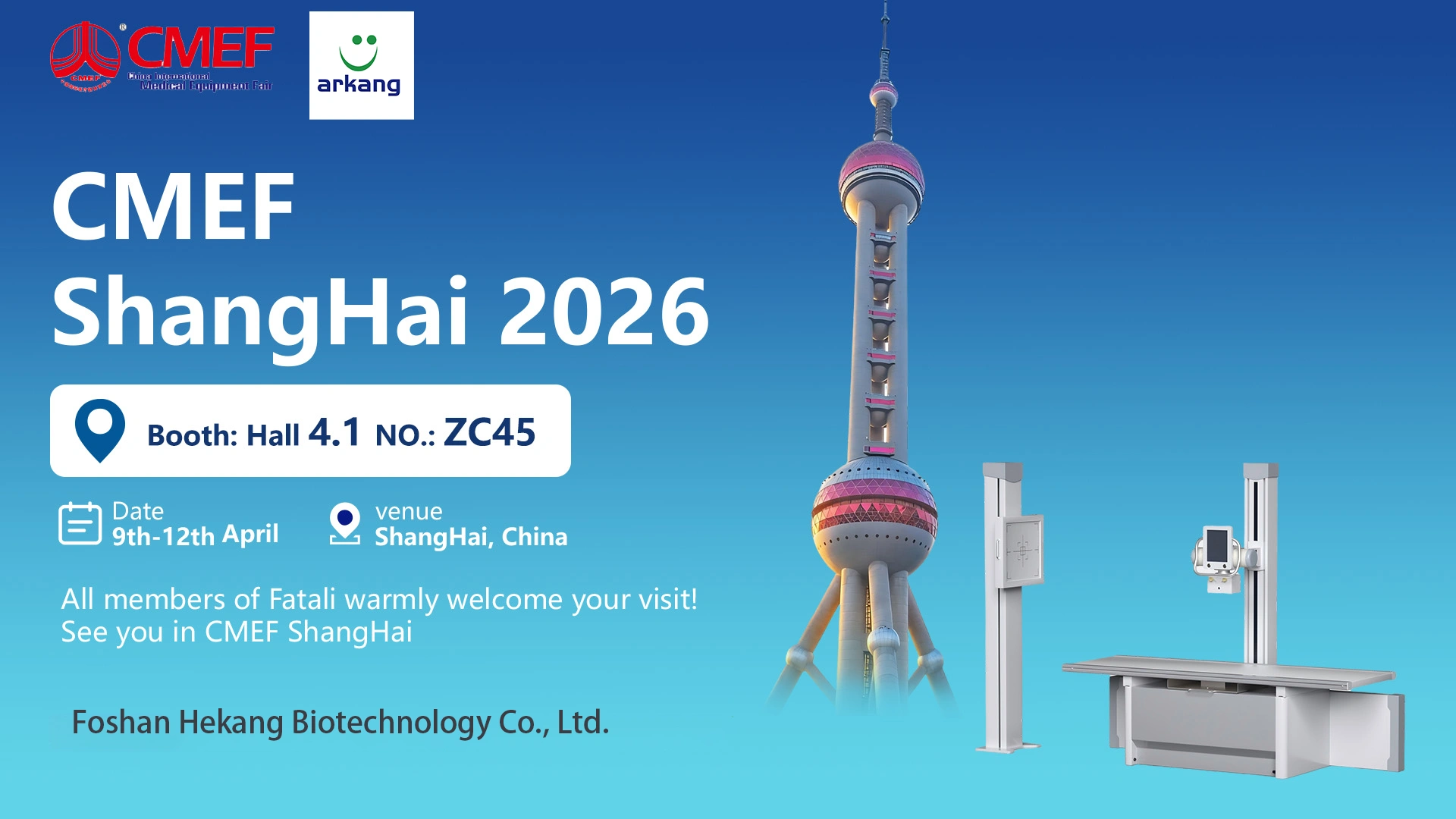 Международная выставка медицинского оборудования в Шанхае 2026 (CMEF 2026) уже не за горами, и мы, компания ArKang (Foshan Hekang Biotechnology Co., Ltd.) , рады пригласить наших клиентов, партнеров и медицинских специалистов со всего мира посетить это ведущее мероприятие в сфере здравоохранения.